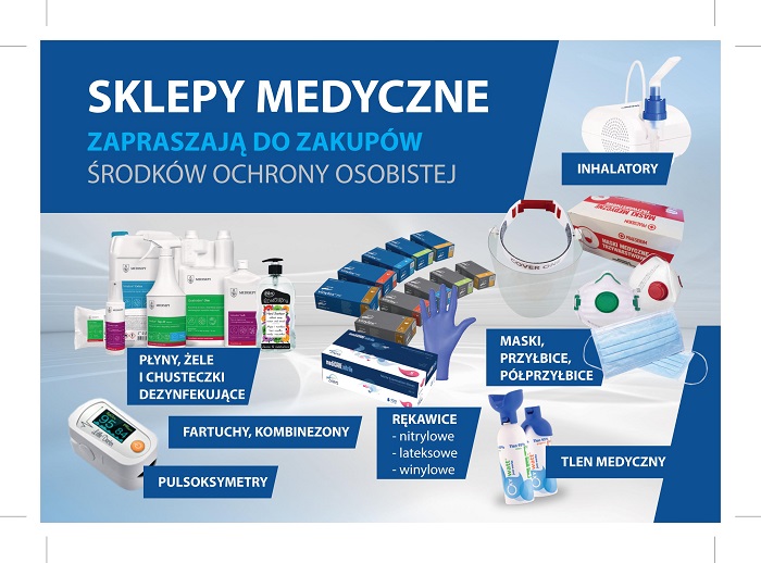 Zachęcamy Państwa do zakupów środków ochrony osobistej takich jak: maseczki chirurgiczne, półmaski ochronne, płyny i żele dezynfekcyjne, rękawiczki, pulsoksymetry itp.